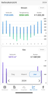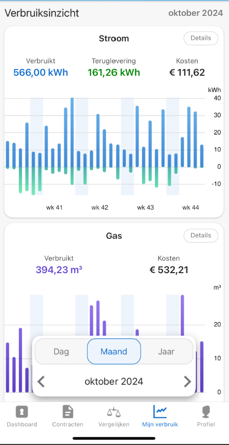 In het Verbruiksoverzicht ziet u bijvoorbeeld dat er in oktober 566 kWh stroom verbruikt is en 161,26 kWh teruggeleverd aan het stroomnet. Ook de kosten worden getoond. Op dit moment worden de terugleverkosten of vaste leveringskosten nog niet meegenomen (peildatum 26-11-2024).