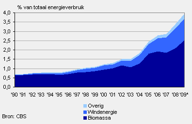 Toch is biomassa de grootste voorziener van duurzame energie; dit aandeel groeide van 2,1% in 2008 naar 2,5% in 2009. Deze stijging kwam met name door de toenemende hoeveelheid biomassa die werd meegestookt in grote elektriciteitscentrales en het stijgende verbruik van biobrandstoffen voor het wegverkeer. Hiernaast nam ook het verbruik van overige biomassa toe.
