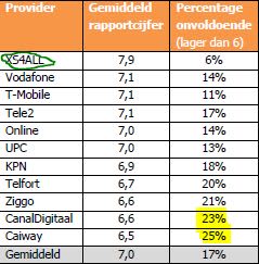 Ook tussen de bedrijven onderling zijn er verschillen. In de telecomsector varieert het rapportcijfer van een 7,9 (XS4ALL) tot een 6,5 (Caiway) en in de energiesector van een 8,1 (United Consumers) tot een 6,9 (NL Energie). Daarnaast valt op dat in de telecomsector bij vier bedrijven 20 procent of meer van de klanten een cijfer lager dan een 6 geeft. In de energiesector is er één bedrijf waarvan 17 procent van de ondervraagden een cijfer lager dan een 6 geeft.