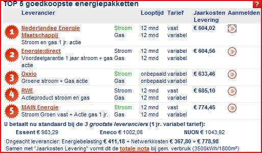 Sinds gistermiddag staat de Nederlandse Energie Maatschappij op 1 in de TOP 5 op Gaslicht.com en Energiewereld.nl. Onmiddellijk nadat Energie:direct de prijs had verlaagd, stelde de Nederlandse Energie Maatschappij het actie-aanbod bij, waardoor deze een halve euro goedkoper is op jaarbasis. Dit betekent dat consumenten die nog nooit zijn gewisseld van energieleverancier, nu bijna 400 euro kunnen besparen door over te stappen op één van de aanbieders uit de TOP 5!