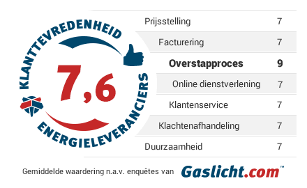 Het klanttevredenheidsonderzoek is een vervolg op de reviewmailing die wij na vier maanden sturen naar overstappers via Gaslicht.com. Ook hier zijn we benieuwd hoe tevreden zij zijn over hun nieuwe energieleverancier voor wat betreft prijsstelling, facturering, overstapproces, online dienstverlening, klantenservice, klachtenafhandeling en duurzaamheid. Deze rapportcijfers zijn terug te vinden bij de leverancierswaardering in onze Energievergelijker onder 'geverifieerde beoordelingen door overstappers'.
