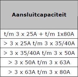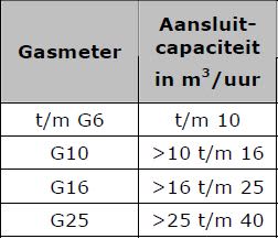In bovenstaande tabellen de soorten aansluitingen voor elektriciteit en gas. U kunt het type gasmeter terugvinden op de meter zelf. U kunt uw netbeheerder vragen naar de aansluitcapaciteit van uw elektriciteitsmeter.