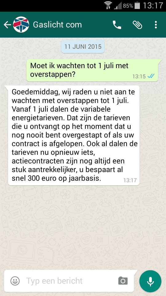 Wij van Gaslicht.com vinden het belangrijk dat u goed en snel geholpen wordt als u energievragen heeft. Daarom zijn wij 6 dagen per week telefonisch bereikbaar. Onze servicedeskmedewerkers beantwoorden uw telefoontjes graag op werkdagen van 's morgens half negen tot acht uur 's avonds en op zaterdag van negen tot vijf uur. Liever chatten of appen? Sinds kort hebben we onze dienstverlening uitgebreid en kunt u ook contact met Gaslicht.com opnemen via chat of WhatsApp.