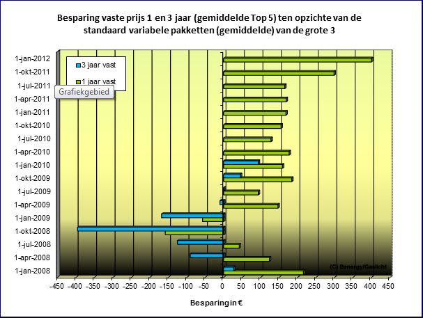 Weergegeven wordt het voordeel of nadeel van 1 jaar vaste prijs en 3 jaar vaste prijs voor stroom en gas (gemiddelde van de Top 5 goedkoopste 1-jarige en 3-jarige vaste pakketten) ten opzichte van de standaard variabele grote 3 (gemiddelde van Nuon, Eneco en Essent). De grafiek van 1 en 3 jaar vast betreft het gemiddelde van de Top 5 goedkoopste pakketten op dat moment. De besparing geeft weer hoeveel een 1-jarig of 3-jarig contract (gemiddelde Top 5) gemiddeld voordeliger of duurder was ten opzichte van de standaard grote 3. De gegevens voor 3 jaar vast stoppen na 1 januari 2010 en voor 1 jaar vast na 1 januari 2012. Dit komt doordat het variabele tarief nog niet bekend is voor de gehele duur van het contract (1 of 3 jaar). Pas wanneer het variabele tarief voor de gehele termijn bekend is kan de vergelijking worden gemaakt. Het verschil is berekend op basis van een gemiddeld huishouden met een verbruik van 3500 kWh stroom en 1800 m³ gas.